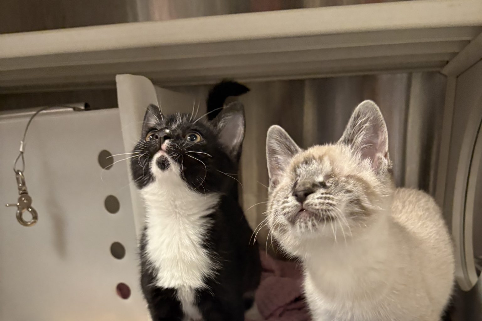 Le chaton demeure en famille d’accueil chez le vétérinaire qui l’a opéré. Encore petit, Pedro avait besoin d’être biberonné tout en étant traité pour ses plaies. « Pour l’aider à s’adapter, nous lui avons trouvé une compagne nommée Câline (un autre chaton orphelin), qui l’aidera à se guider dans sa nouvelle famille. »