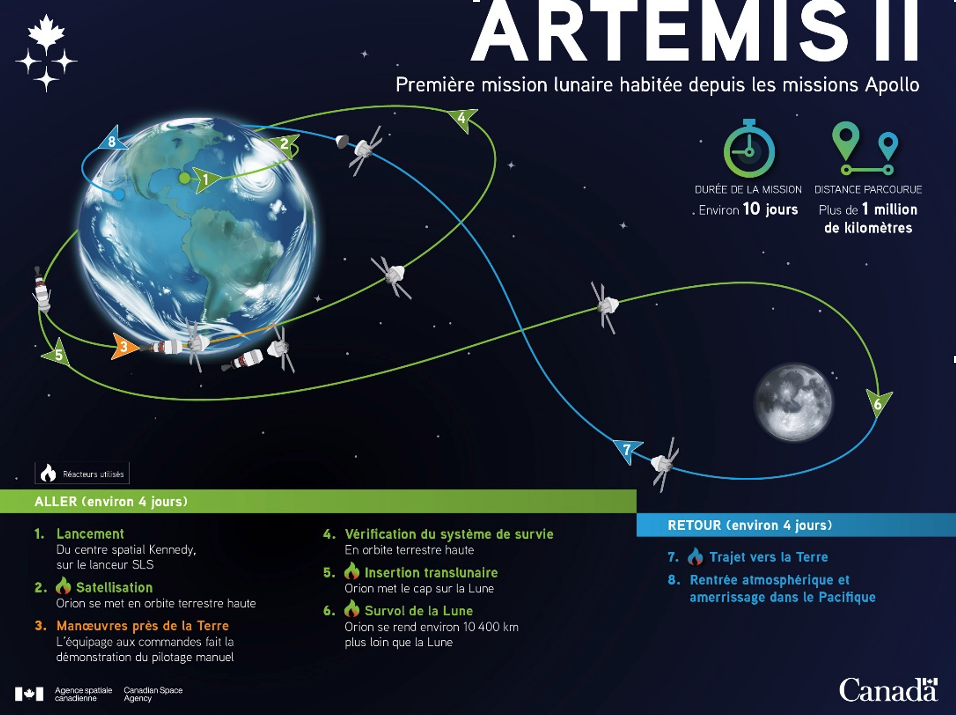 Pour des raisons de sécurité, la capsule Orion suivra une trajectoire dite « retour libre », qui garantit le retour grâce à la gravité lunaire pour la renvoyer directement vers la Terre sans avoir besoin d’allumer ses moteurs. Le vaisseau passera derrière la face cachée de la Lune à environ 10 300 km de sa surface. (Voir la photo dans la galerie d’images)