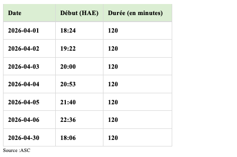 C’est un intervalle de temps qui est déterminé par la position de la Terre et la Lune. Cela peut paraître simple, mais il faut considérer la rotation de la Terre ainsi que l’orbite lunaire. En date du 25 mars 2026, voir les dates prévues dans la photo de la galerie d’images.