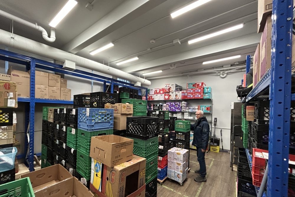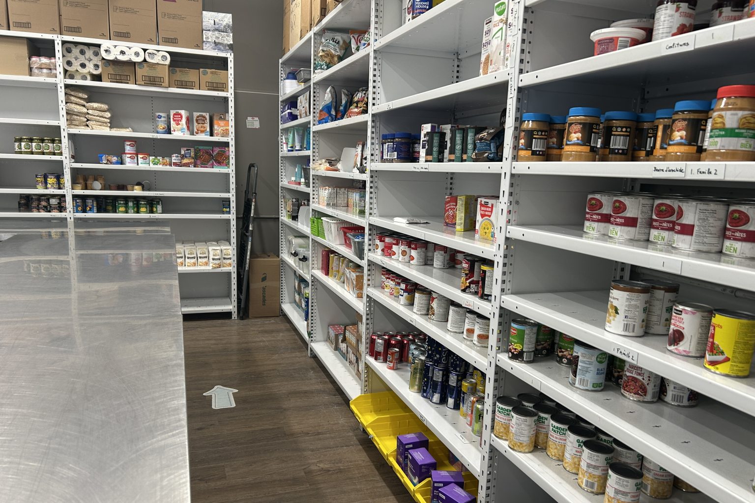Nous rejoignons Richard Lalancette, trésorier du CEB, dans le garde-manger de l’organisme, un local de 1 000 pieds carrés aux airs de charmante petite épicerie où se succèdent des rangées de denrées sèches, de conserves et de jus, soigneusement organisées.
