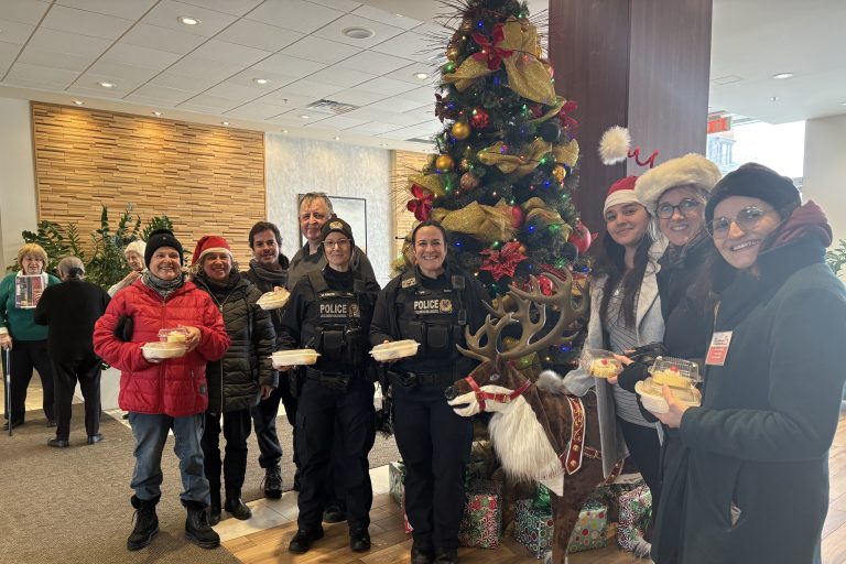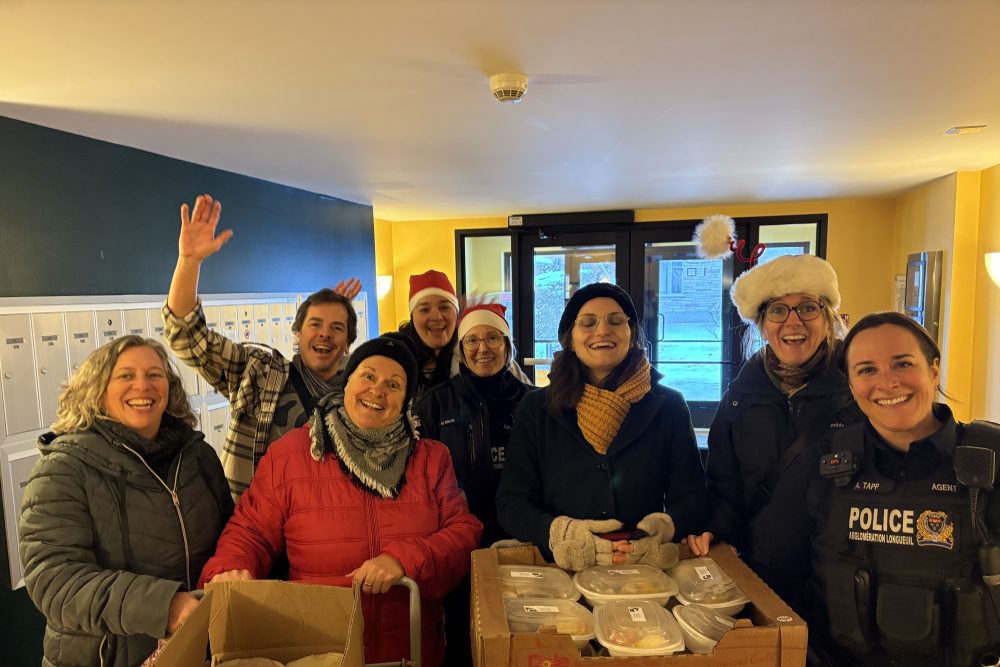 Le 11 décembre, le rendez-vous est donné à la maison pour aînés Caléo, un établissement du Groupe Maurice à Boucherville. Depuis trois ans, le rituel est le même, celui de récupérer des plats cuisinés par le chef de l’établissement et leurs locataires au profit des résidents de HLM de la ville. « À Boucherville, il n’y a que des HLM pour aînés », précise Mme Lussier. L’Office municipal d’habitation de Longueuil fait aussi partie de l’organisation de la journée, tout comme les policières du Réseau d’entraide sociale et organisationnelle (RÉSO), et cela depuis le début du projet. « On est là depuis le début. On est bien implantés à Boucherville. Il y a une très belle collaboration avec les organismes communautaires, ici », d’indiquer Amélie Tapp, qui, avec l’uniforme du Service de police de Longueuil, s’apprête, avec sa collègue, à participer à l’opération.