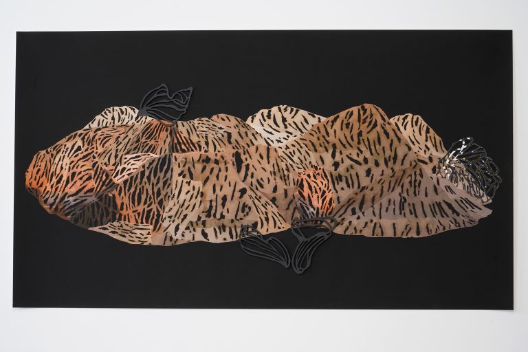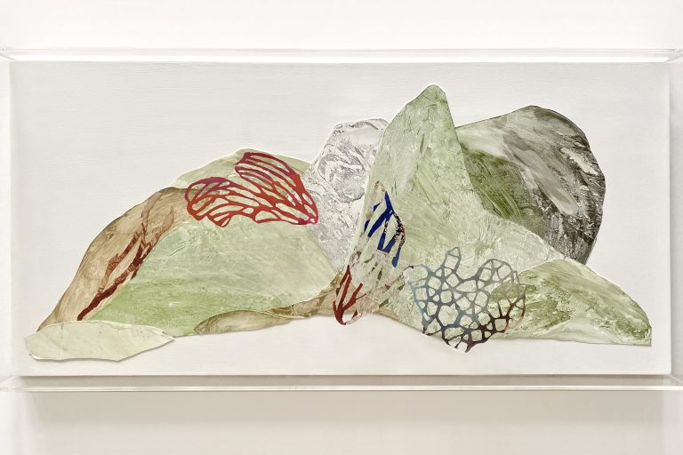 « C’est avant tout un travail de collage avec différents formats tels que le papier, le bronze, l’aluminium, souligne l’artiste. Ces matières viennent en transparence avec des articles de magazines découpés qui créent du relief. »