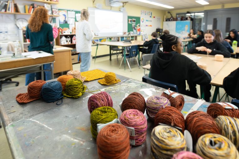 Josée Bournival, en résidence à l’école De Mortagne, mène son projet de médiation culturelle Maille-mots, Maille-maux en classe d’arts plastiques des élèves de deuxième secondaire. L’objectif, recueillir les maux des adolescents à travers l’art du crochet, tout en ayant comme objectif d’en écrire un livre.
