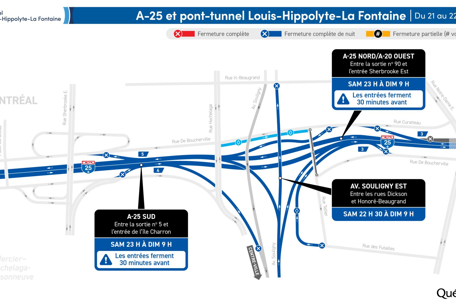 Fermeture de l’autoroute 25 Le ministère des Transports et de la Mobilité durable annonce la fermeture complète de l'autoroute 25 durant les nuits du 21 au 22 février.