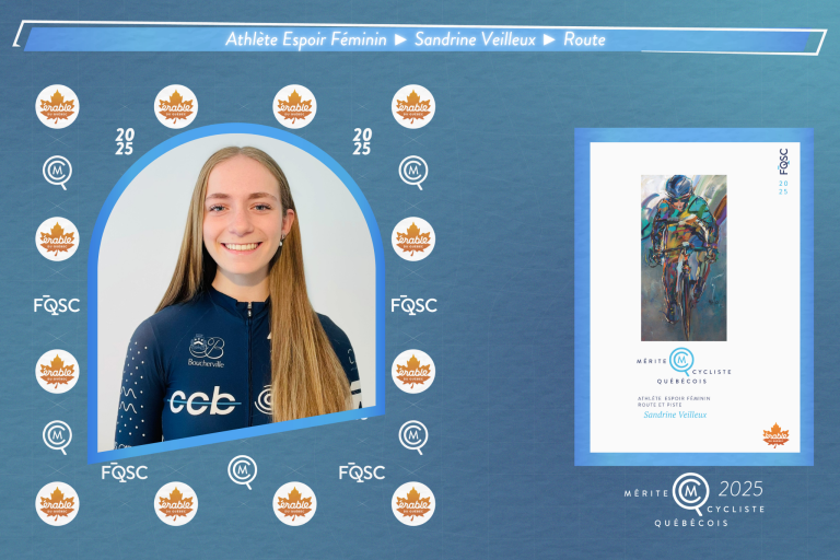 L’année de Sandrine Veilleux en cyclisme sur route Après une année exceptionnelle, Sandrine Veilleux, originaire de Boucherville a été récompensée par la Fédération québécoise des sports cyclistes (FQSC) du prix de l'Athlète espoir féminin de l'année au gala du Mérite Cycliste Québécois qui avait lieu le dimanche 2 novembre à Bromont. Hier, elle recevait le prix de l'athlète féminine niveau québécois au Gala Sports Québec 2025.