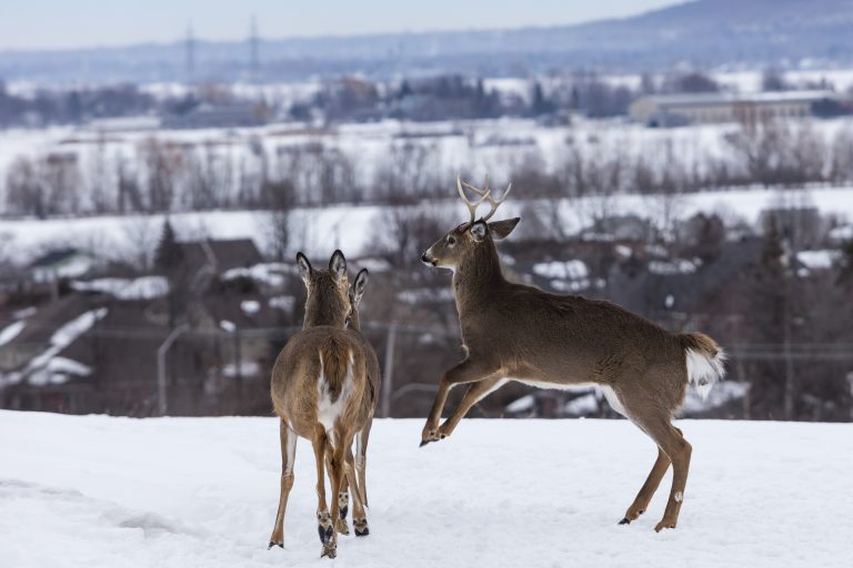 Bien que l’on puisse parfois l’apercevoir en ville à la recherche de branches et de brindilles pour s’alimenter, le cerf de Virginie change ses habitudes en hiver. Il bouge moins, mange différemment et cherche refuge dans les forêts denses, là où la neige est moins épaisse. On appelle ces zones de rassemblement des » ravages « .